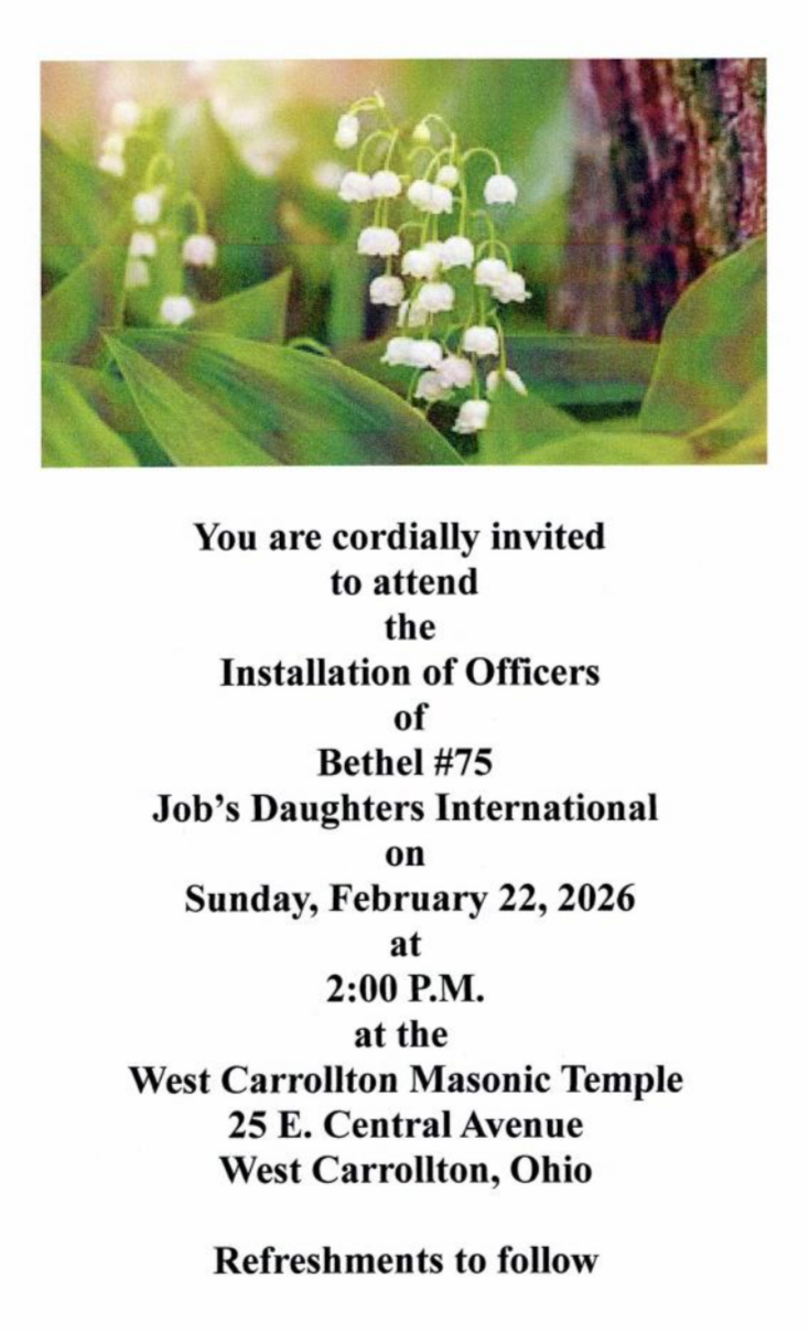 Here are some important and exciting dates for our new location for Job’s Daughters in the Southwest region now located at the West Carrollton Masonic Lodge (Jacob Eby Chapter)